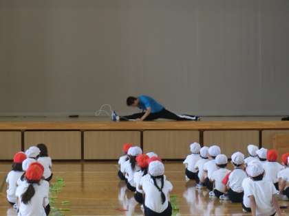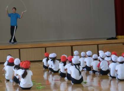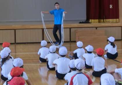 2学期に入って間もないころ、2年生は、なわとびの楽しさを教えてくださるゲストティーチャーをお迎えして体育の授業を行いました。なわとびパフォーマーの藤沢祥太朗先生です。最初に藤沢先生が繰り広げるすばらしい技の数々を見せていただきました。みんな真剣に、先生の技に見入っています。