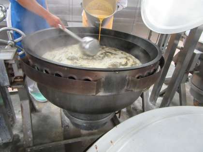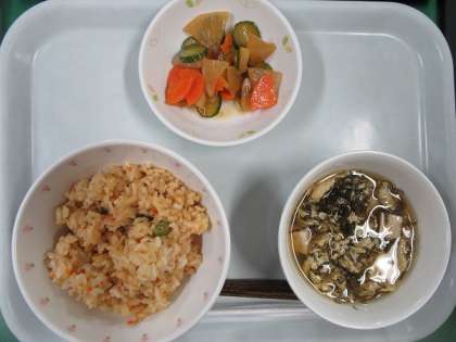 運動会の練習に頑張るみなさんへ、給食室から応援の気持ちを込めた給食を提供します。今日はネバネバ食感のもずくをかきたま汁に入れました。見た目はシンプルですがもずくのトロミで口当たりが良く食べやすい1品です。