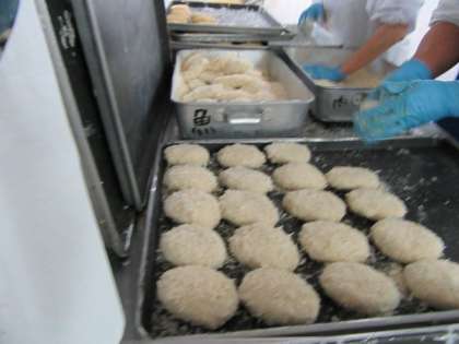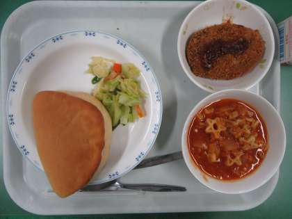 今日はセルフコロッケサンド、自分でコロッケをパンにサンドします。コロッケは生のじゃがいもを切り、蒸しつぶす作業から給食室で行われています。揚げたてのコロッケを嬉しそうにパンにはさみ、しっかり食べていました。