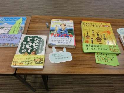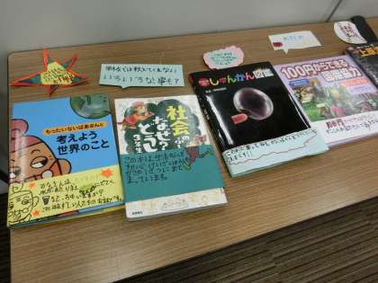 4年生の教室には、子供たちの学習の成果もたくさん掲示・展示されていました。写真は、国語の学習で、おすすめの本の「帯」作りをしたときのものです。本をていねいに読み、おすすめの理由を書きました。