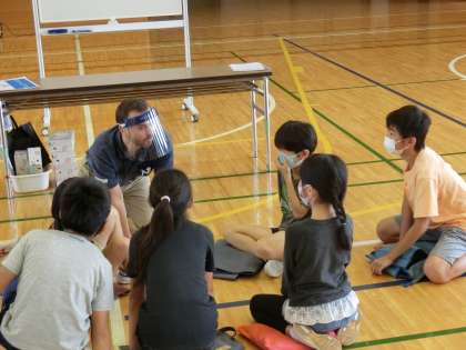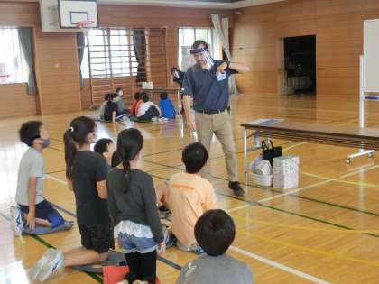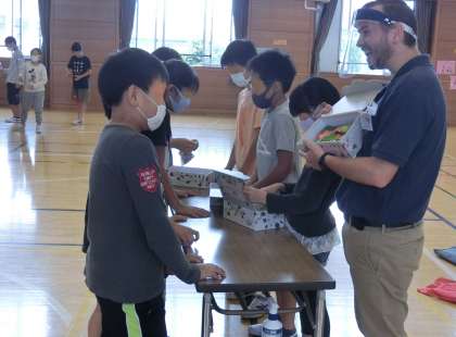 「コミュニケーションコーナー」の様子です。このコーナーでは、来日した外国人へのおもてなしや海外での買い物などのバーチャル体験をしながら、英語でコミュニケーションしようとしている様子です。日本の良さを伝えるプレゼントを考え、プレゼントを渡しました。とても楽しそうに自分の思いを伝えていました。