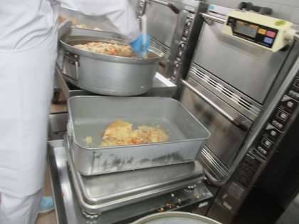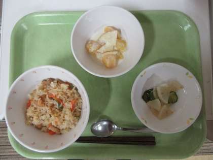 今日のごはんは鶏飯です。しょうゆ味に炊いたご飯に鶏肉・野菜・白滝などを甘辛く煮た具としっかり混ぜました。給食のおかずは各学級ごとに量が異なります。食缶のごはんを計りながら分けています。