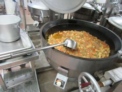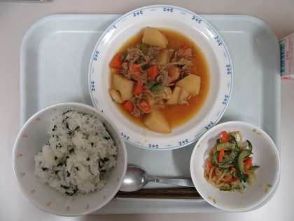 家庭でも定番料理の肉じゃがは、給食でも多く提供しています。給食室では回転釜の火力を上手に使い、煮ています。豚肉や野菜などのうま味がじゃがいもに染みた、おいしい肉じゃがを各学級に配缶します。