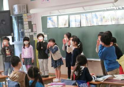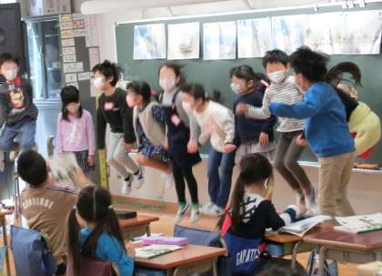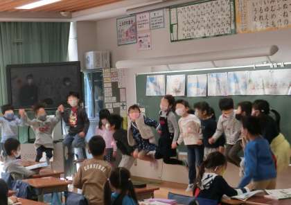 3クラスともに、国語の授業を公開しました。物語文「くじらぐも」の学習です。これまでの学習の成果を発表しているクラスもありました。物語の世界を音読で表現しました。「天までとどけ、1・2・3」の場面では、思わず飛び上がる子供たち。体いっぱい使って表現していました。担任が子供たちのがんばりをほめました。「今日の音読すばらしかったです。でも、もっとすばらしかったのは練習しているみなさんのがんばりです。役割も表現の仕方も動作も歌も、すべて自分たちで考えました。よく話し合い、協力できました。話し合うことって、とってもむずかしいけれど、みんなでつくり上げたことがすばらしいです。」と。子供たちはうれしそうに先生の話を聞いていました。