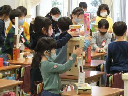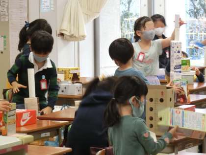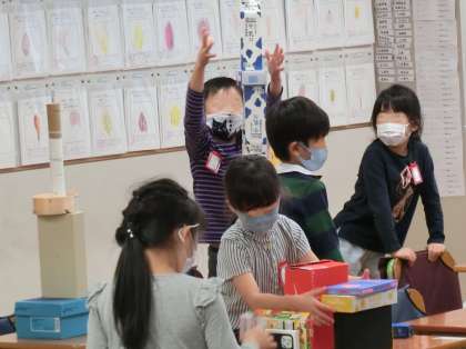 身の回りにある箱を積み重ねながら四角形の形をとらえていきました。子供たちは、数学的活動を楽しみながら、形の概念を理解していきます。できるだけ高く積み重ねようとみんな一生懸命です。