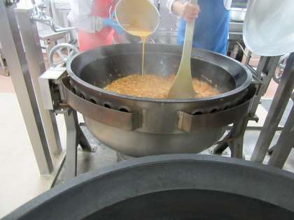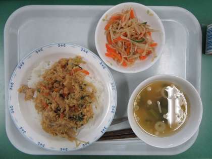 今日は定番の丼、親子丼です。溶き卵を具に混ぜて煮込み、みつばを仕上げに加えます。せたがやそだちの野菜の収穫が始まりました。ねぎ・里芋・だいこんは可能な限り世田谷産を使います。