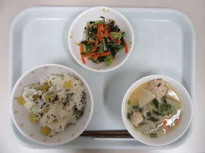 今日のさつまいもごはんは、うるち米ともち米が1:1の割合です。味付けは薄めの塩味、さつま芋と一緒にご飯を炊きました。黒ごまを加えて良く混ぜて出来上がり、さつま芋の甘みとご飯の塩味が良いバランスになっています。