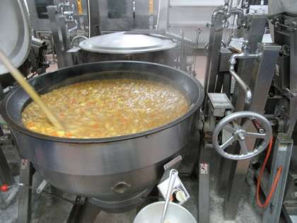 給食室で小麦粉・油・バター・カレー粉を弱火で加熱し、カレールーを作ります。鶏ガラスープで煮込んだ具にカレールーを加え、更に弱火で煮込みチキンカレーの完成です。