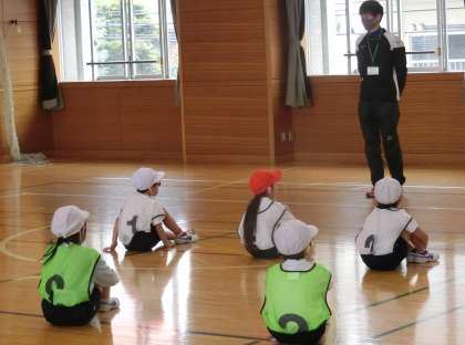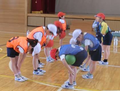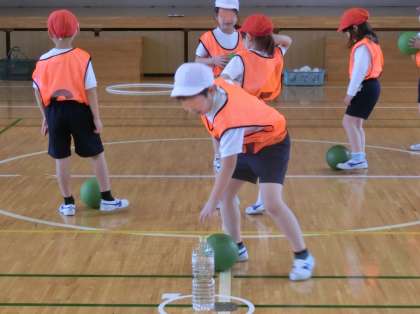1年生の体育授業の様子を紹介します。この日の体育は「体つくり運動を楽しもう」です。蹴る、運ぶ、当てるといった多様なボール運動を通してボールを操作する動きを身に付けるようにしました。楽しみながら活動するゲームを通して、ボールを操作する力を高められるように工夫しました。ゲームの準備も子供たちが自分たちで行えるよう導いていきました。相手チームとあいさつをしっかり交わすことも大切にしました。この日の授業者は、教育実習のために2週間、子供たちと学習したり生活したりしている先生です。教育実習の最後のまとめとして授業を行いました。