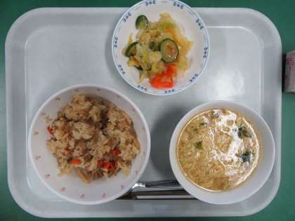 中国には笹の葉にもち米・豚肉・野菜などを包み蒸す(ゆでる)ちまきという料理があります。今日は笹の葉なしおこわをつくりました。野菜ともち米の食感、ごま油の香りがおいしいおこわができました。