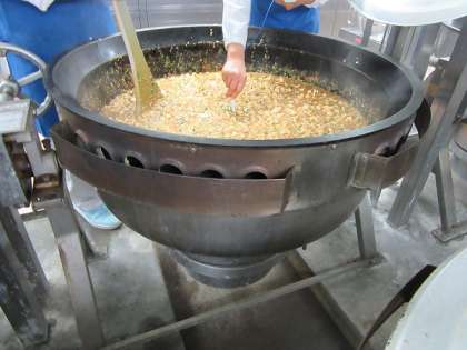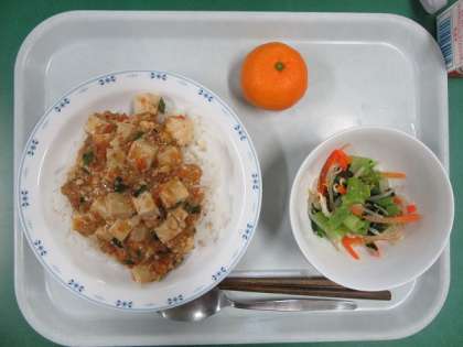 今日は定番の献立、麻婆豆腐丼です。麻婆豆腐には、ねぎ・にんじん・しいたけ・大豆などを豚ひき肉と一緒に炒めています。加熱調理時には中心温度を計測して、安全を確認しています。