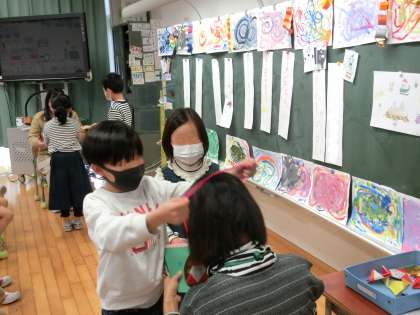 12月23日、1・2学期にお世話になった小1サポーターの皆様をお迎えして、1年生が「感謝の会」を開きました。小1サポーターとは、1年生の給食や授業の支援をしていただく、本校で実施している取り組みです。1年生をサポートしてくださるのは地域の皆様です。今日は、小1サポーターの皆様に日ごろの感謝の気持ちを伝えました。子供たちが考えたゲームをしたり、司会進行をしたり、一緒に給食を食べていただいたりと、楽しくてあたたかな「感謝の会」を子供たちが企画しました。プログラムも手作りしました。
