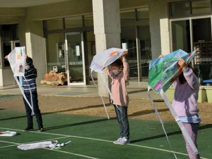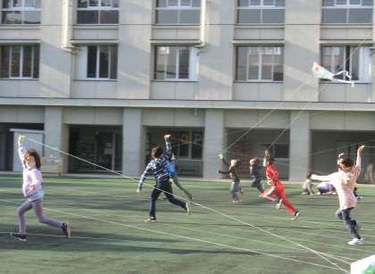 みんな全力疾走です。友達の協力もあって、たこが気持ちよさそうに青空に上がりました。