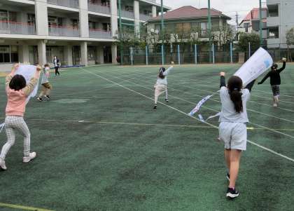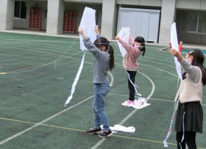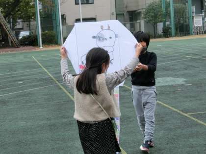 2年生が生活科の時間に、日本の古くから伝わる遊び「たこあげ」に挑戦しました。子供たちが手にしているたこは手作りです。かわいい絵、力強い絵、個性的な絵・・・子供たちの描いた世界が、空に舞い上がりました。