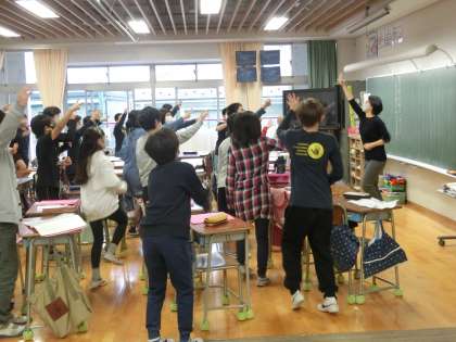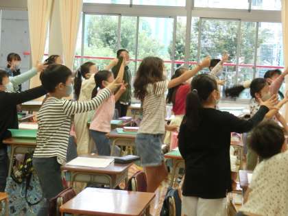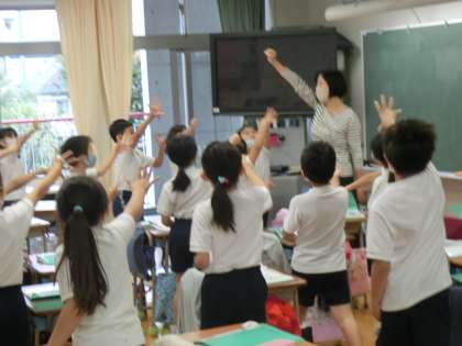 2年生の子供たちははつらつと音楽朝会を楽しみました。みんな笑顔いっぱいです。隣の5年生もリズムに合わせて、先生と元気に! シャンケン、ポン!