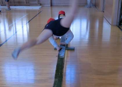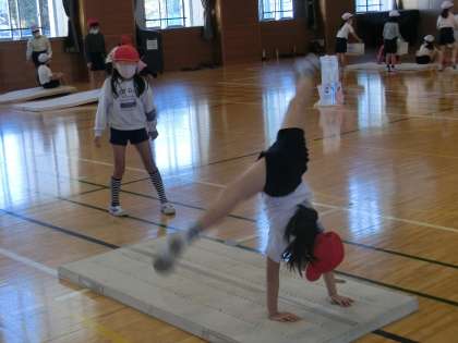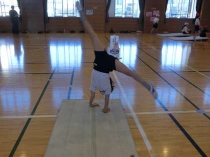 「かえるとびこし術」をマスターするコースです。この動きは、側転につながる大切な動きになります。手の着き方、回転の仕方、足の着き方などを意識してたくさん練習しました。