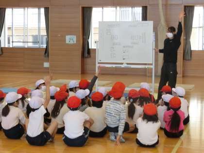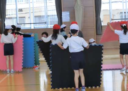 準備運動後は、マットの片付けも自分たちで行います。その後、今日の授業のねらいを確認しました。これからコースに分かれて練習が始まります。