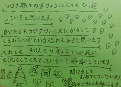 「医療従事者の皆様にメッセージをおくろう」という東京都教育委員会からの呼びかけがありました。駒沢小学校の多くの子供たちもメッセージを書きました。紹介しているメッセージはほんの一部ですが、子供たちが書いた1枚1枚からあたたかな心が伝わってきました。400枚近いメッセージカードは、25日に東京都に送りました。子供たちの思いが多くの皆様に伝わることを願っています。