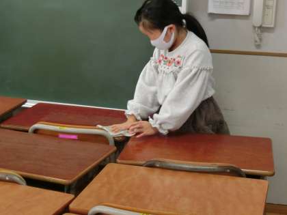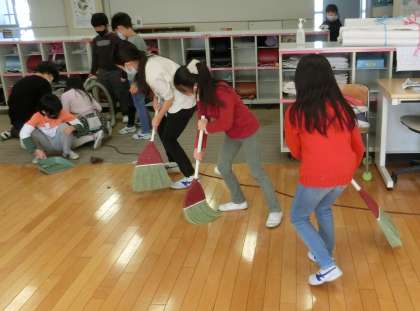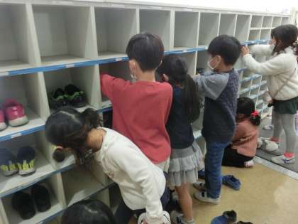 掃き掃除、拭き掃除、掃除機による絨毯の掃除など、とっても上手にお掃除する子供たち。自分たちが使う下駄箱もきれいにしました。