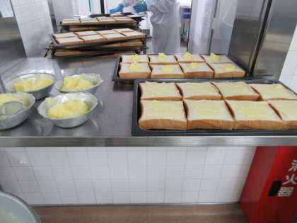バタートーストはバターとグラニュー糖を混ぜてペースト状にして、食パンに1枚ずつ丁寧にぬりトーストしました。しっかりペーストの量を計量して味のムラがないように作業をしています。