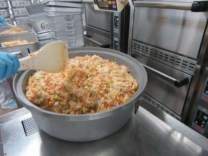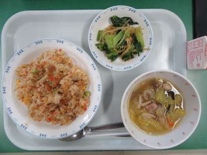 野菜・豚肉・えだまめを炒めた具と炒り卵をご飯を混ぜてチャーハンの出来上がりです。今日の具にはにんにくのみじん切りも加えているので、香ばしいにんにくの香りが口に含んだ時に広がります。