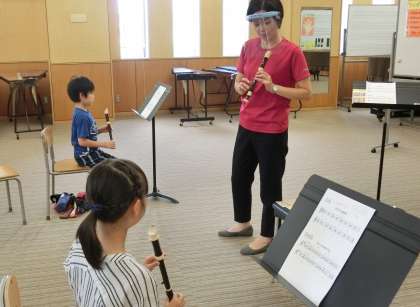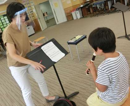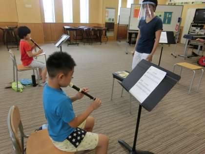 夏・・・学校では補習が行われました。夏の「つなぐ」教室です。写真は、初めてリコーダーを練習する3年生の様子です。このような形ではじまったリコーダーの練習。音を重ねた動画合奏は、子供たち一人一人の努力のあらわれです。