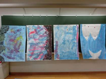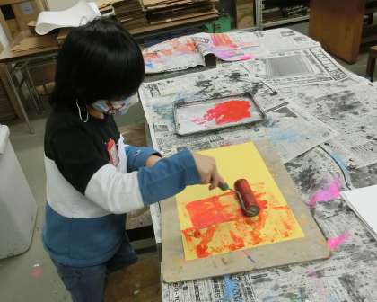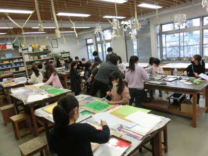 色とりどりの海の世界。スイミーをはじめとする魚たち。イソギンチャクやイセエビ。太陽の光・・・物語の世界を感じた色で表していきました。