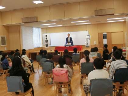 5年生は、休校期間中に国語の学習で落語について学びました。その学びを「つなぐ」ために、落語家の柳家花緑さんにほんものの落語を披露していただくことになりました。出囃子の音楽に合わせて登場した柳家花緑さんを、5年生の子供たちは胸躍る思いでお迎えしました。「つる」「初天神」の演目で大笑いし、そばを食べるしぐさやリンゴをむくしぐさのポイントを習いました。子供たちもとても上手に演じていました。