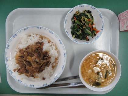 先月2月から、国産牛肉が給食で使用できるようになりました。使用した牛の個体識別番号を納品時に業者から受け取り、学校で保管をします。今日は牛丼、たまねぎと長ねぎの甘みが牛丼のタレに合う献立になりました。
