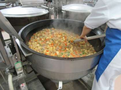 駒沢小学校には大きな回転釜が6台あります。1台で120kgほどの調理をする事ができます。今日は定番料理の肉じゃがうま煮です。釜の火力を使い、しっかり煮ました。