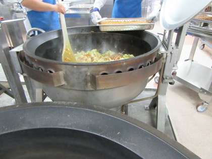 今日のソース焼きそばには野菜が1人分100gと、野菜をしっかりと食べられる献立になっています。炒めた具にオーブンで蒸し焼きした麺をしっかり混ぜてできあがりです。シャキシャキとした野菜の食感も残すため、キャベツは麺と同時に加えています。