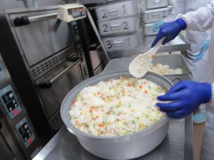 にんじん・コーン・えだまめの3色の彩りがきれいなピラフが炊き上がりました。バターや具をしっかり混ぜて出来上がりです。各学級ごとに計量を行い食缶に入れていきます。