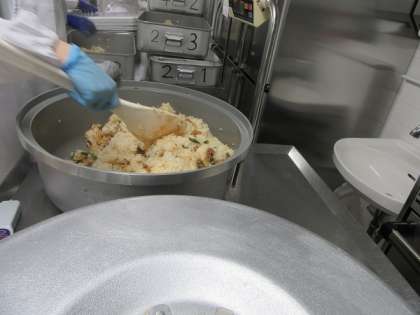 今日のおこわにはもちきびを加えています。もちきびは米に比べて小さい黄色の粒ですが、食物繊維・亜鉛などの栄養を多く含む食材です。食べやすいしょうゆ味のおこわに炊き上がりました。