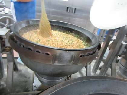 麻婆豆腐丼の具の麻婆豆腐には、にんじん・しいたけなどのみじん切りも加えています。またひき肉に食感も似ていることから、大豆のみじん切りも具に加えています。たくさんの食材のうま味を閉じ込めた、人気献立麻婆豆腐のできあがりです。