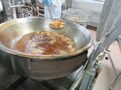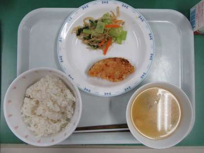 今日は竜田揚げ、しょうがじょうゆダレに漬けたメルルーサを揚げています。サクッとした衣の食感がおいしい魚料理を子ども達はしっかり食べていました。