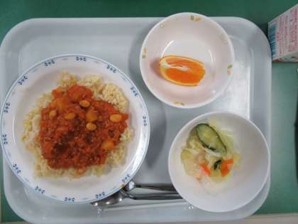 今日の献立はカレー味の炊き込みごはんにチリコンカンをかけるチリビーンズライスです。野菜・豚ひき肉・トマトをじっくり炒め煮にして、辛さ控えめのチリコンカンをつくりました。