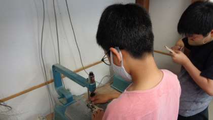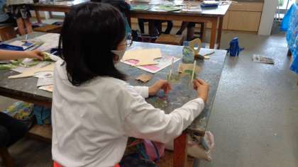 昨年度の展覧会で5年生は「彫り込み版画」で作品を制作しました。今回図工で、その時に彫った版木を使って、オブジェ作りをしています。何色も色を重ねて刷り込んだ版木は、中には湿気を吸って反りかえったり、曲がってしまったりしたものもあります。でも、それもまた味わいのある材料になります。子どもたちそれぞれが想像を膨らましながら、生まれ変わらせます。