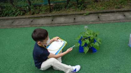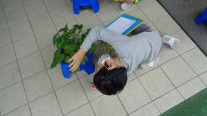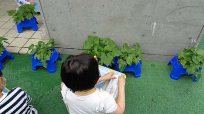 すくすく成長するアサガオ。「どうなっているのかなあ」じっくり観察しています。