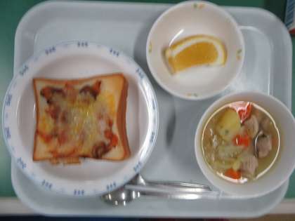 パンは柔らかくて沢山噛まなくても食べられますが、よく噛むことを意識してほしいと思います。今日はピザトーストにして焼いてパリッとした食感のパンと野菜をたっぷり入れたピザソースとチーズをしっかり噛んで、おいしく食べられる献立にしました。