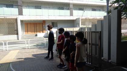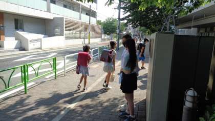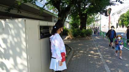 5年生の生活安全員会の児童と6年生のあいさつ当番が、元気なあいさつで迎えます。
