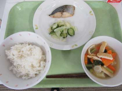 来週から梅雨入りの予定です。今日は少し早いのですが梅雨入りの献立、梅肉を使った献立にしました。しょうゆだれにみじん切りにした梅肉を加えてサワラを漬けて焼きました。