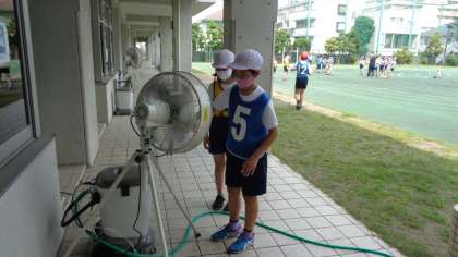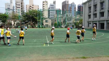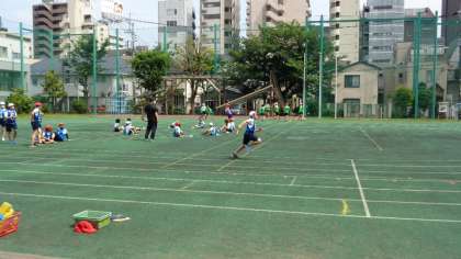 バトン渡しやコーナーの回り方などを学習して、リレーをしていました。もちろん、途中で休憩しながら行っています。
