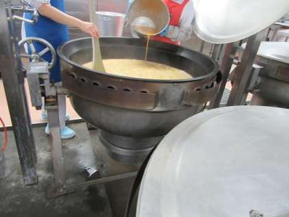 少し遅れて梅雨入りになりました。蒸し暑い日にはこまめな水分補給が必要です。食事で水分と汗となり排出されるナトリウムなどのミネラルをとることも大切です。今日は濃厚なだしでつくったかきたま汁です。ゆっくり卵液を釜に加えます。