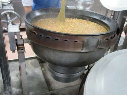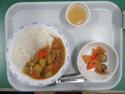 今日は定番献立のポークカレーライスです。鶏がらスープで煮込んだ具にカレールウを加えてとろみをつけます。人気が高いカレーライスを子ども達はしっかり食べていました。