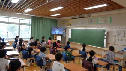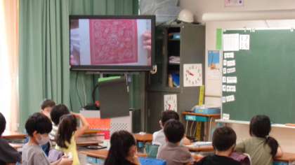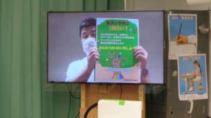 今朝の朝会では、120周年のお話がありました。PTAの保護者の方々が貼ってくださったポスターの紹介、エンブレムの紹介、記念に作られるバンダナの紹介がありました。1年生の教室では「あれ、貼ってあったよ!」「あのバンダナの絵、○○さんのだ!」など、テレビを見ながら声があがっていました。