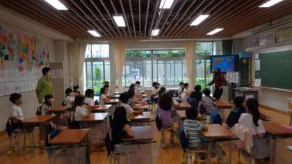 外国語活動の授業で、英語で国の名前を話しています。いろんな国の名前、言えたかな?