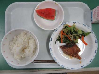 今日の魚は旬の魚カツオ、デザートはすいかです。新鮮な小玉スイカを均等に切り分けて、各学級に配ります。