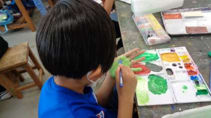 一人一人の顔が違うように、手も一人一人違います。自分で木の葉の色を作って、手で描きます。