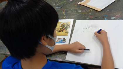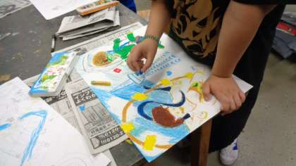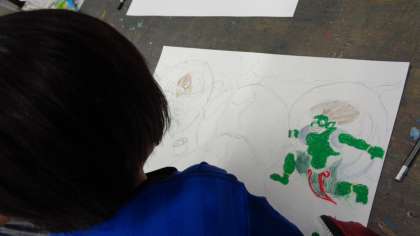 風神雷神の絵を自分なり解釈しながら、模写していきます。こんな神様がいたら・・・昔の人は何を思い、考えてこの絵を描いたんだろう。作品との対話と自分の考えを組み立てることを行き来しながら、描いていきます。