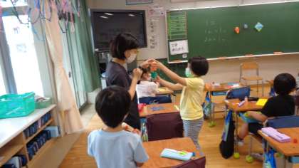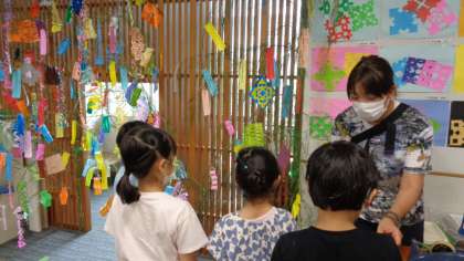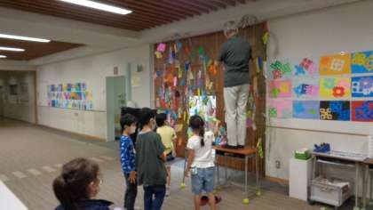 今日は七夕です。願い事を書いた短冊と、色紙で作った飾りを笹に飾ります。